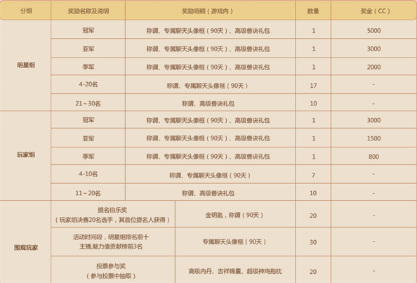 注:按照游戏魅力值+精灵投票,给予前20名游戏内奖励,按照直播产生的CC礼物积分排行,给予前3名现金奖励
