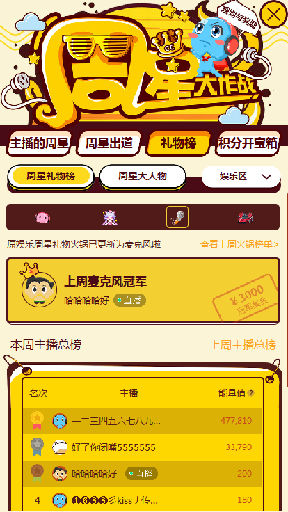 娱乐周星将引入“麦克风”礼物,该礼物赛道将计算游戏和娱乐所有主播能量值,赛道奖金不变,仍为3000元。