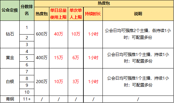 公会评级评分由三项公会直播指标计算获得,指标每日更新一次,每自然月清零。
