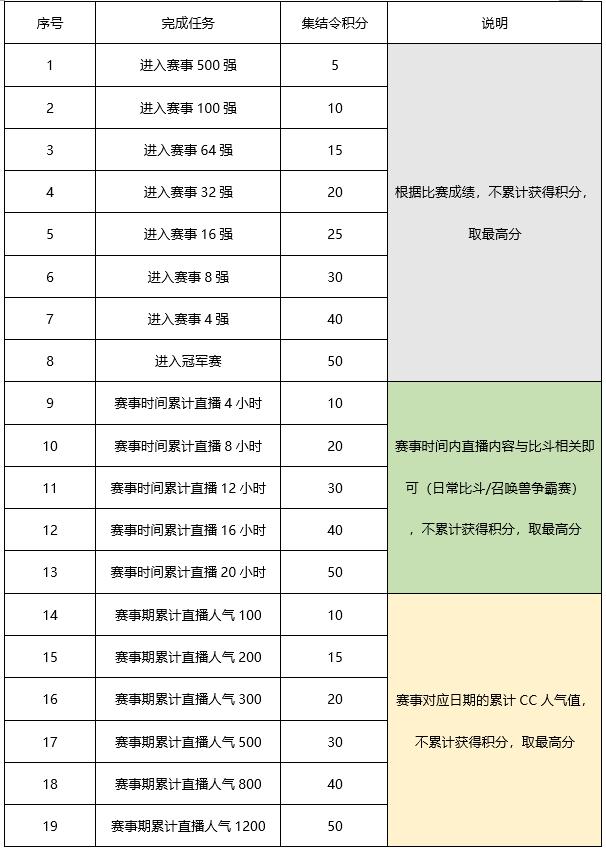 1、活动期间,玩家可通过参与召唤兽争霸赛前往CC进行直播获得集结令积分;