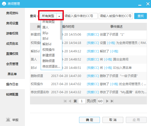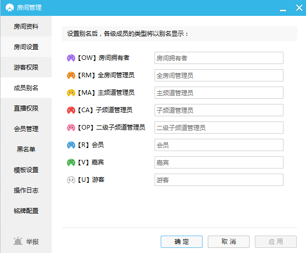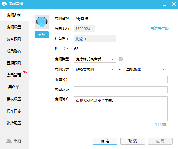 房间拥有者(OW)和全频道管理员(RM),可以在房间资料中可以设置房间名、房间分类、公会、网站以及房间简介。 拥有者栏目下,则是当前拥有者的CC昵称。