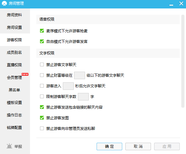 这个页面是管理员对房间里所有游客权限进行设置的。 包括:是否可以抢麦、自由模式下是否可以聊天、语音聊天等。