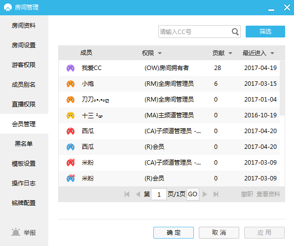 在这个页面上,你可以看到房间里所有权限的所有成员的列表。