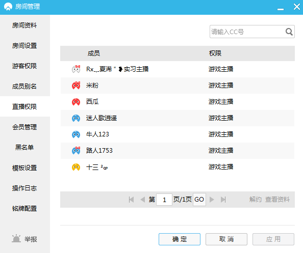 在这个页面上,管理员可以管理本房间的直播权限。