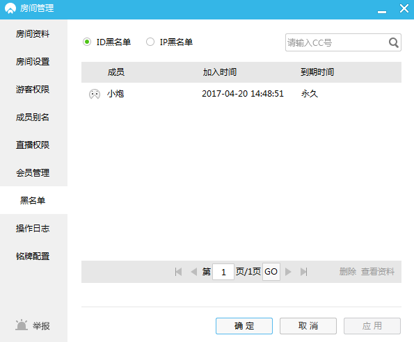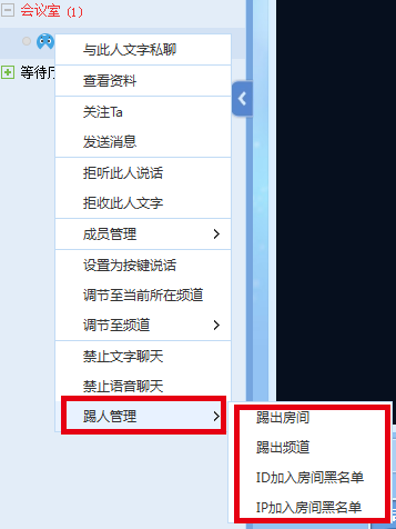 当管理员在房间内,对某个成员使用右键,选择“踢人管理”、“ID/IP加入房间黑名单”功能项时,则可以将对方加入到本房间的黑名单里。 在没有手动解除黑名单前,该用户是无法登录房间的。