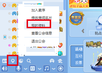(1) 在房间中,先点击“找自己”按钮定位到自己,右键点击自己,在右键菜单中选择“我的资料”