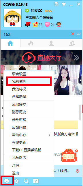 (3) 点击CC主窗口左下角的“菜单”按钮,选择“我的资料”
