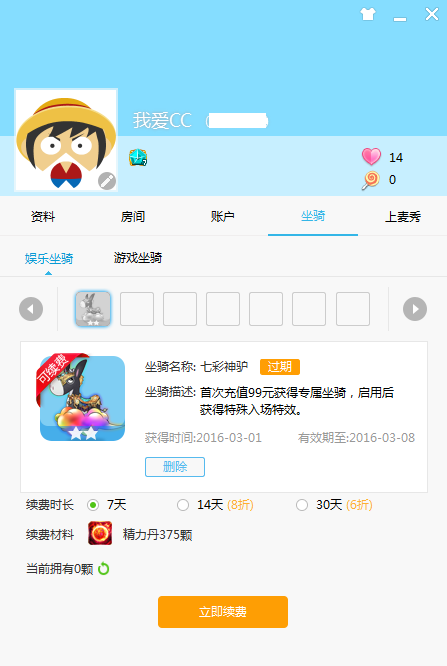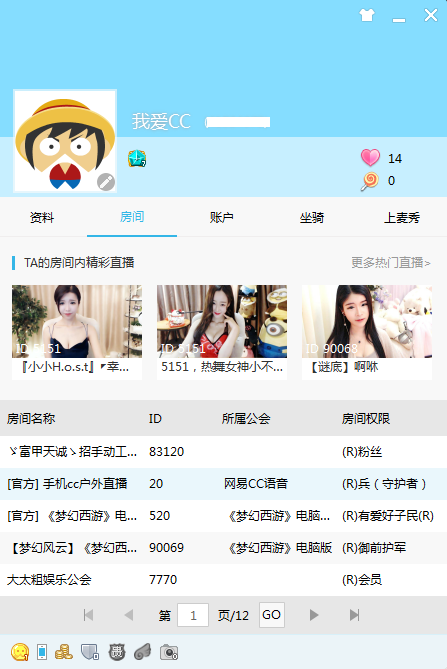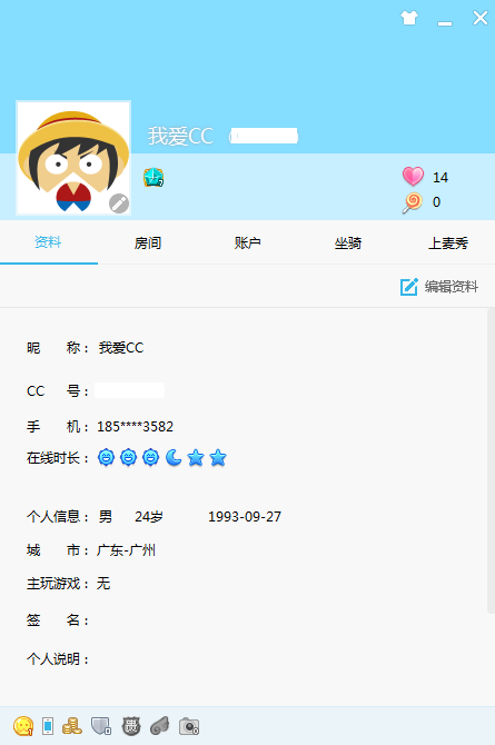 在我的资料中,您可以设置个人基本资料、查看我的房间、我的帐户、坐骑、设置上麦秀等。点击编辑资料,还可以对自己已拥有的铭牌尾灯进行展示管理。