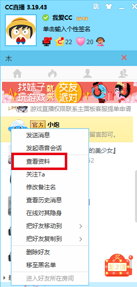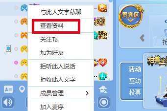 (1) 在房间中,先找到好友,在右键菜单中选择“查看资料”