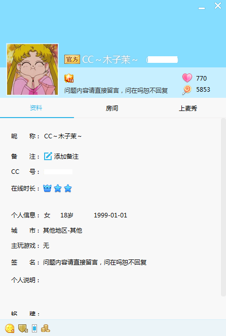 打开好友资料后,您可以查看好友的CC个人ID、个人资料等信息。